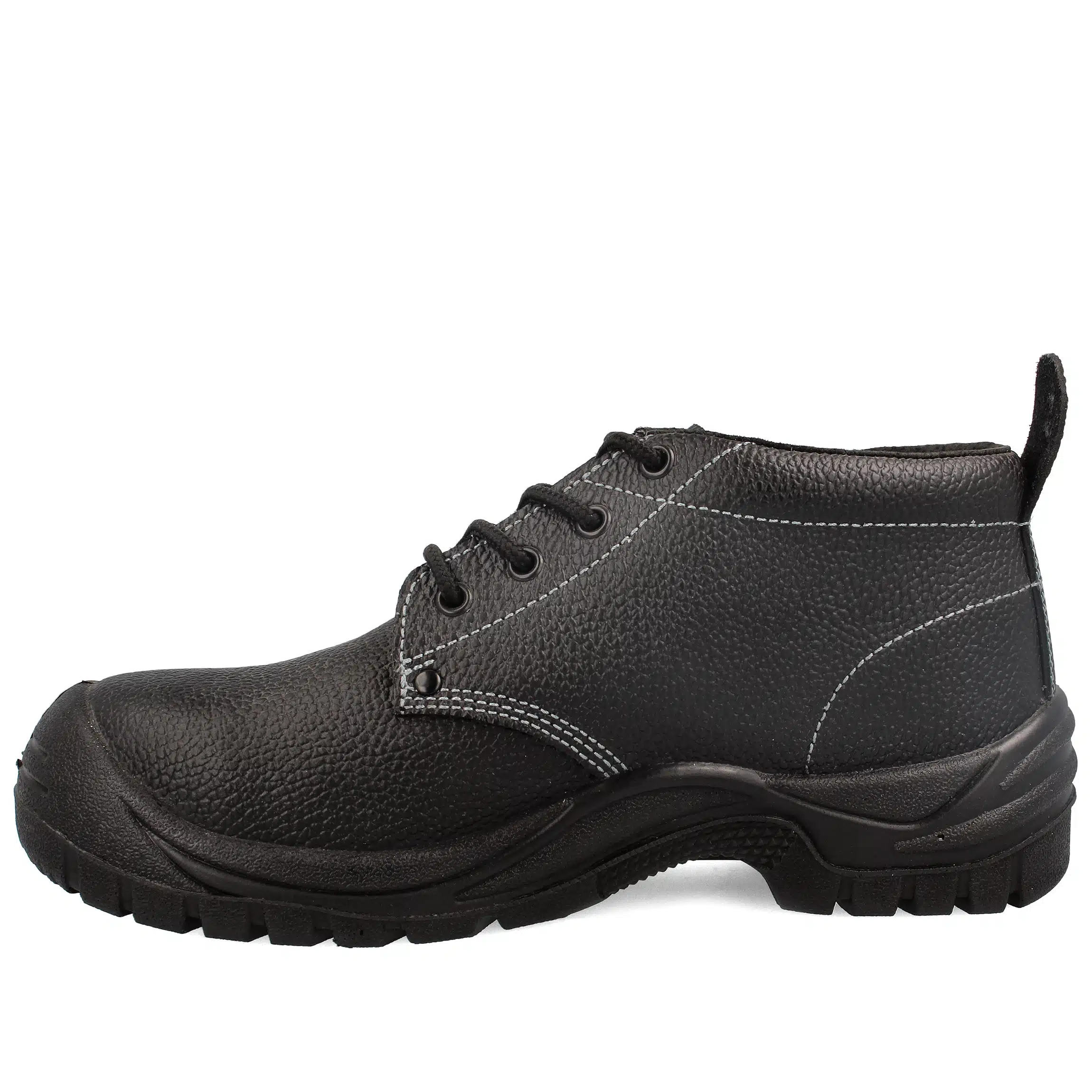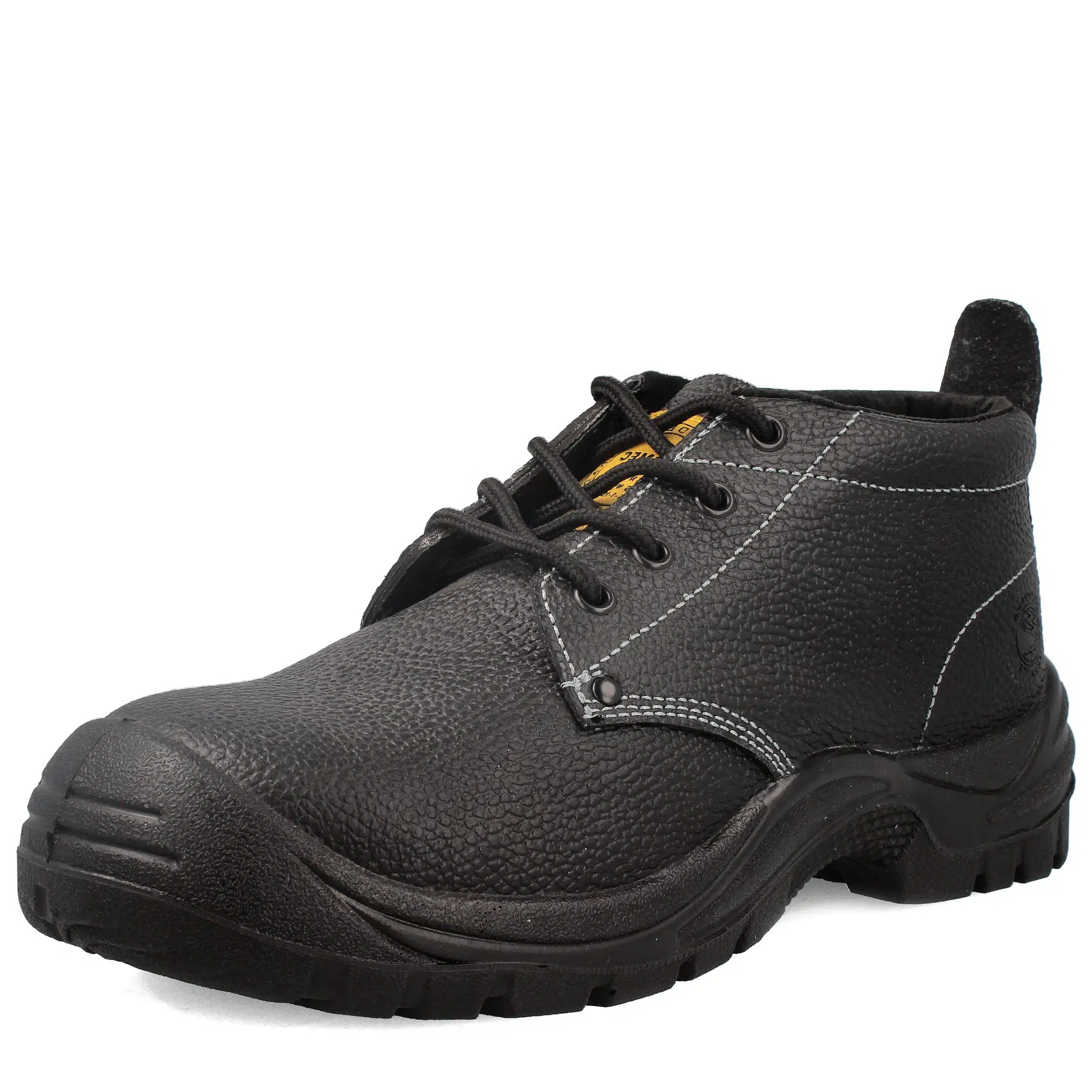 Botín de seguridad, fabricado en cuero estampado, entre suela de Poliuretano de baja densidad ligera. Planta de poliuretano de alta densidad, de excelente resistencia a los hidrocarburos y sus derivados. Incorpora plantilla metálica anti perforante.